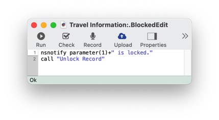 The next component is the Unlock Record procedure. This will appear in the Action menu. This code asks the user to type in a password. If they type in the correct password (in this case presto), all the fields will be unlocked, and they can edit the current record. You’ll want to change the password to one of your choice.