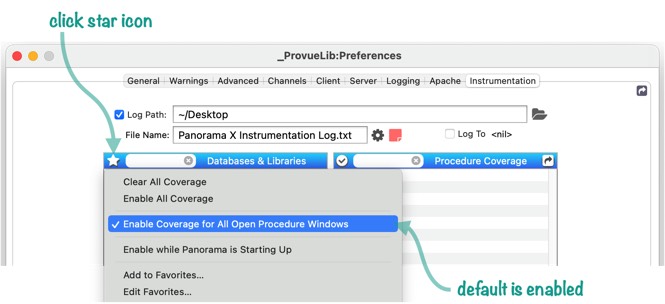 If for some reason you don’t want opening a procedure window to automatically enable instrumentation coverage, click on the star icon in the Instrumentation panel and un-check the Enable Coverage for All Open Procedures option.