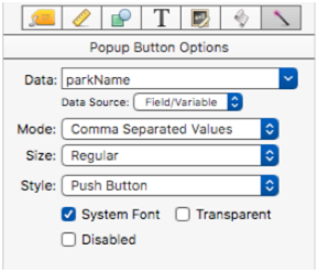 Data – This is the field or variable that is linked to the pop-up menu. You can either type in the name of a field or variable, or you can choose a field name from the pop-up menu (on the right). Panorama will also auto-complete field names as you type.