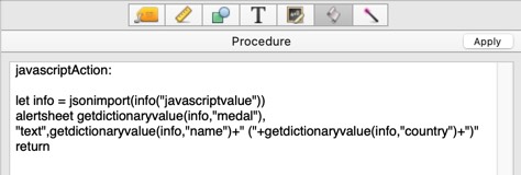In many situations you’ll want the JavaScript to calculate a value and return that value back to your Panorama code. The value could be a number, text, or a compound value like an array or an object (JavaScript objects are equivalent to Panorama Data Dictionaries). Let’s start with simple non-compound values. This example calculates the sum of 2+2 using JavaScript and puts it into the Panorama somenumber variable.