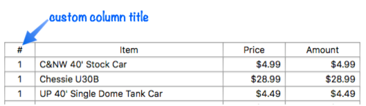 Usually the line item field name is used as the title of each column (without the Ω suffix), or the field title if it has one. If you want to specify a different title, use the <title> tag on that line (you can use it on as many fields as you like):