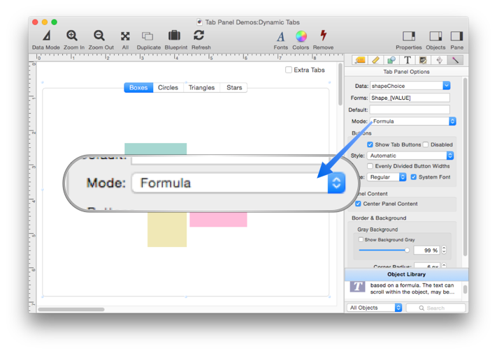 The next step is to select the Tab Panel Object and change the Mode from Comma Separated Values to Formula.