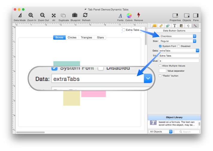 Let’s see how this was set up. The first step is to add a checkbox object (see Data Button Object). This checkbox has been set up to link to a fileglobal variable named extraTabs. When the checkbox is clicked, the extraTabs variable will toggle between blank and a non-blank value (specifically, between blank and x).