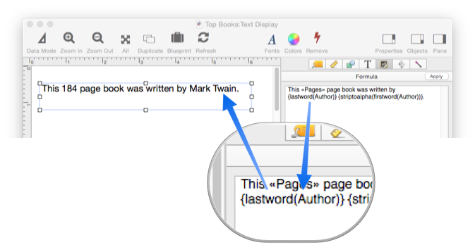 You can also insert a complete formula into the literal text by surrounding the formula with the { and } characters. (However, if you find yourself doing a lot of this it might be better to switch to the Formula mode.) In the database used in this example, the author names are stored in the format Last, First. The formula is used to reverse the order and display the name in the format First Last (actually there are two formulas).